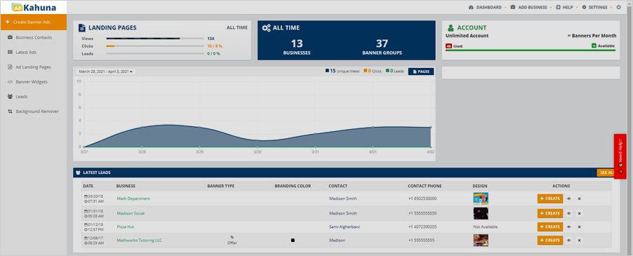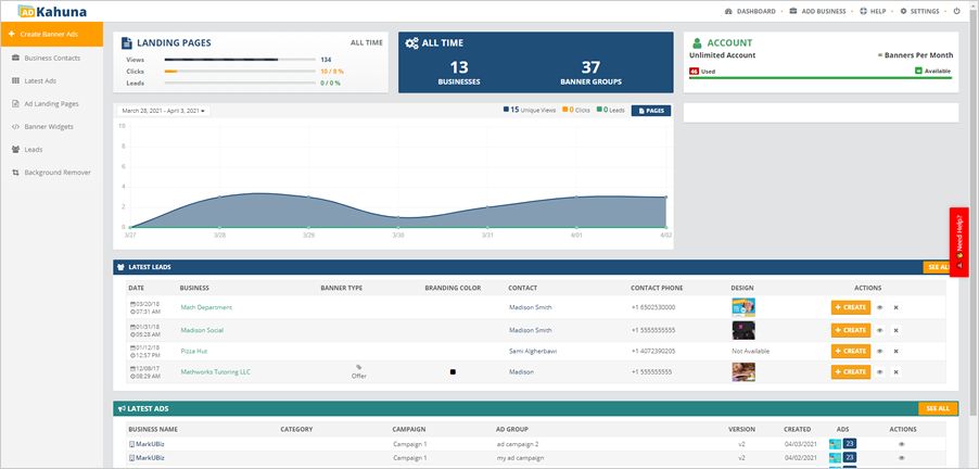 The Main Dashboard is your "Monitoring Room" that lets you see all the information about your Landing Pages, Account, Banners, and the companies you created. Your Latest Leads and their performance can also be viewed here.
