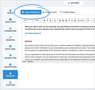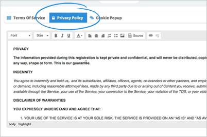 The first is your Terms of Service (TOS). Go through the TOS section and make sure that everything is covered for your business and how you are set up to conduct business.