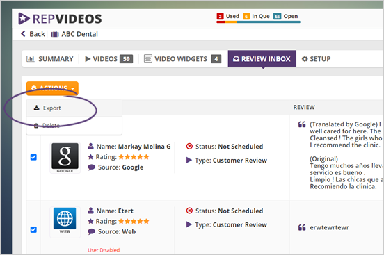 If you need to export all of the reviews that you selected to a PDF file, click Actions and choose Export from the drop-down.