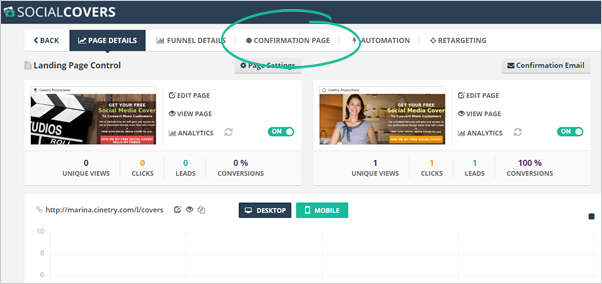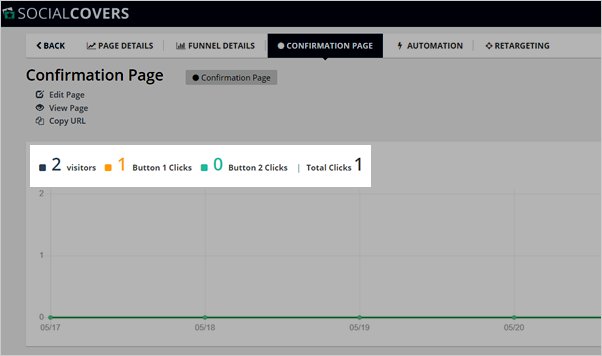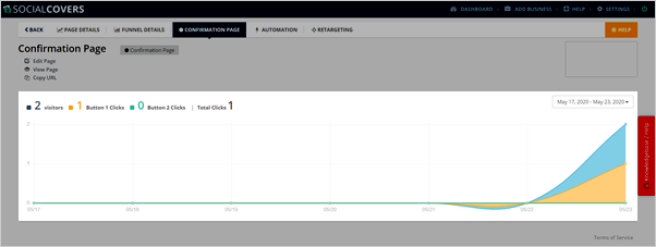 The Confirmation Page Analytics display a mathematical analysis of a page's performance. This includes the total number of visitors and total clicks from each button.
