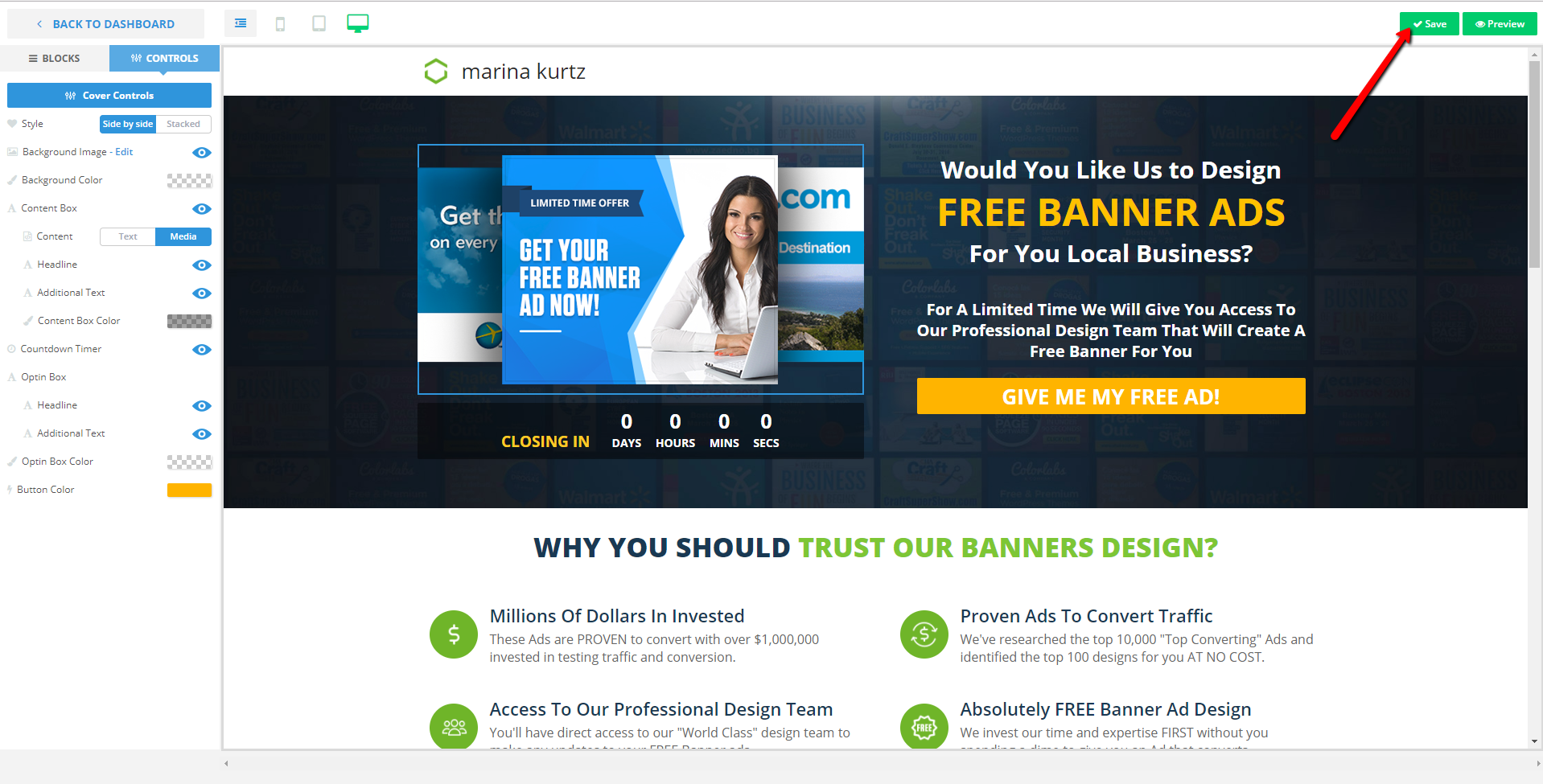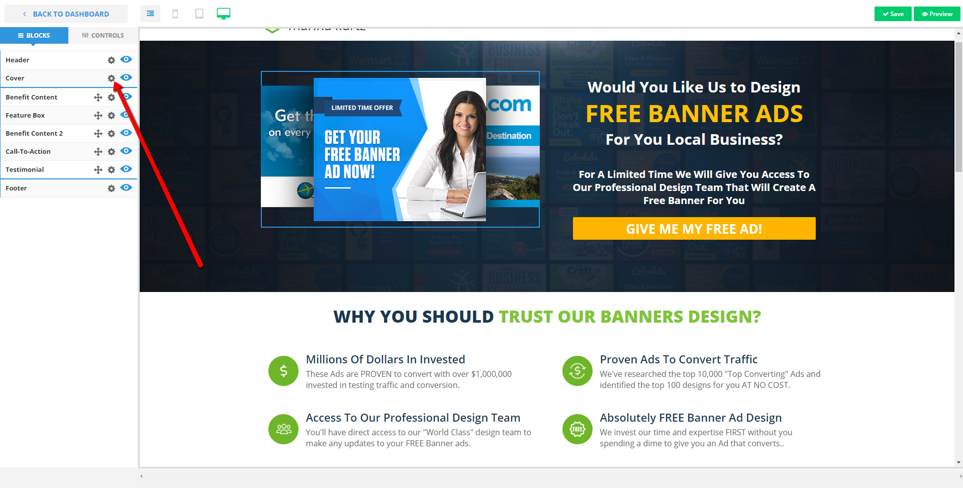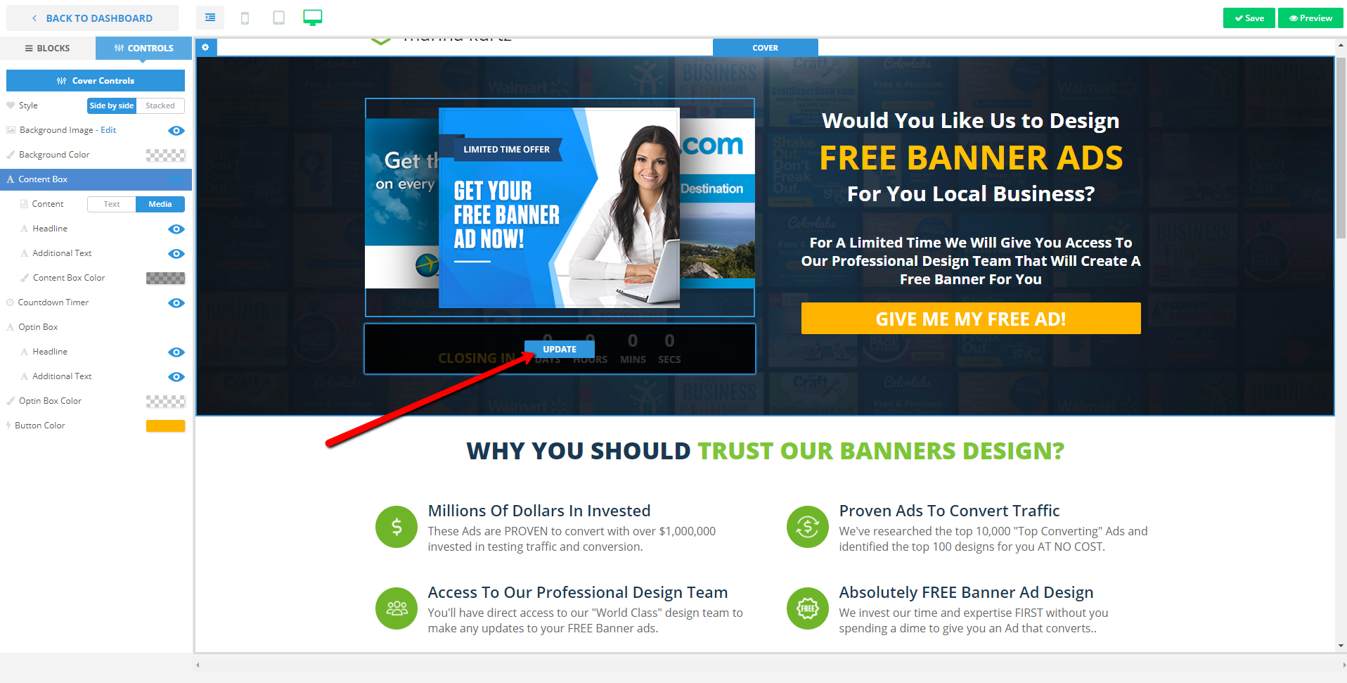 In the Landing Page preview window, hover your mouse over your Countdown Timer and click