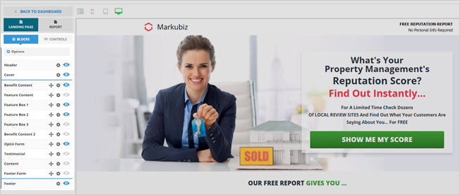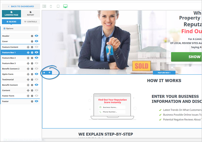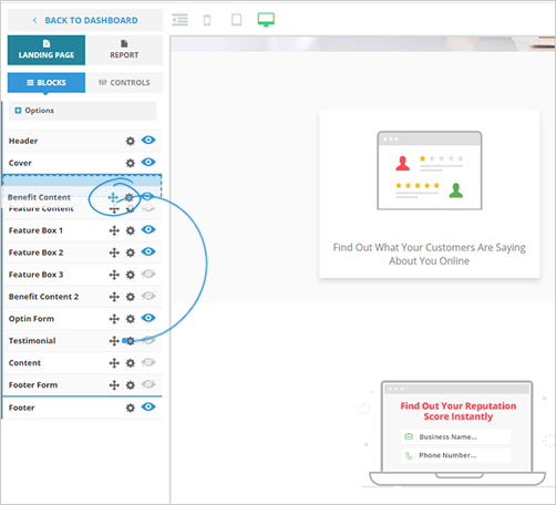 Your Landing Page Blocks are found in the left sidebar control section. You can update each block separately and move them freely to change the order of the sections and layout. Arranging them is easy—drag sections to the top or down to the bottom of your page.