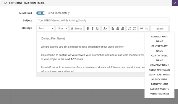 Step 5. Add Tokens to populate the leads’ responses to the lead generation form into your message for a custom look and feel.