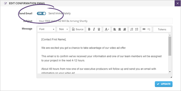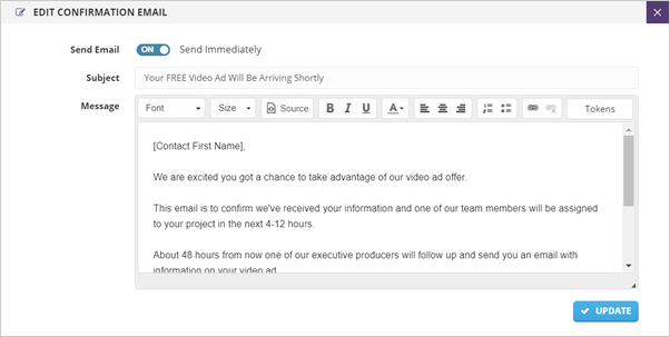 Step 6. Click Update to save the changes to your landing page confirmation email.