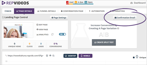 Each Landing Page you create lets you tailor an email confirmation message to your lead after they complete the process of creating their own Rep Videos.