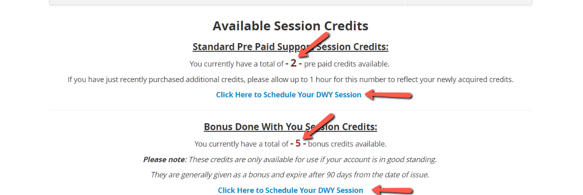 Tip: We want to be sure you are using your credits or available sessions ONLY for things that actually require a session. We know your time is valuable, so when in doubt, you can contact Customer Success to see if you truly need a session or if we can address your needs in a quick ticket.