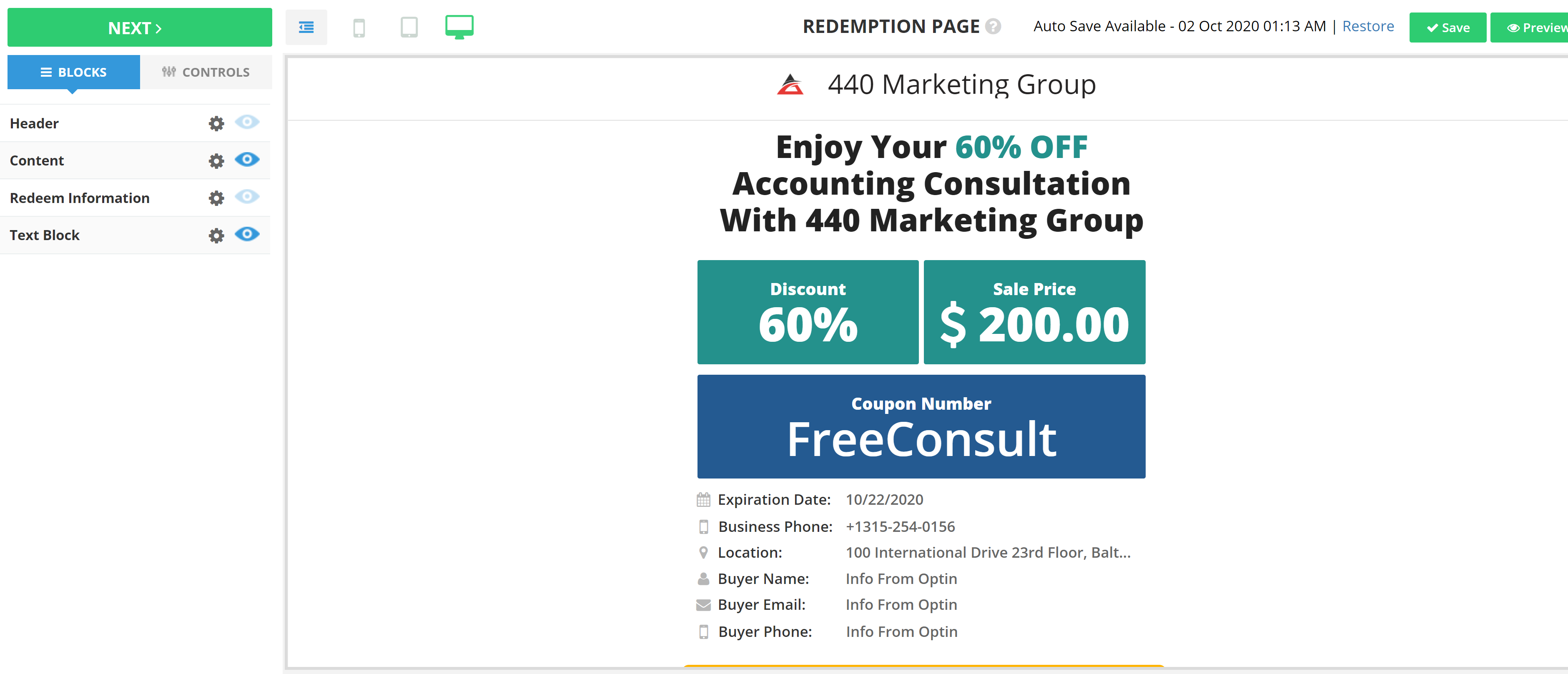 You will be redirect to the Redemption page next (Coupon). It will already have all the details in place by now, so all you need to do is review the details and adjust if necessary.