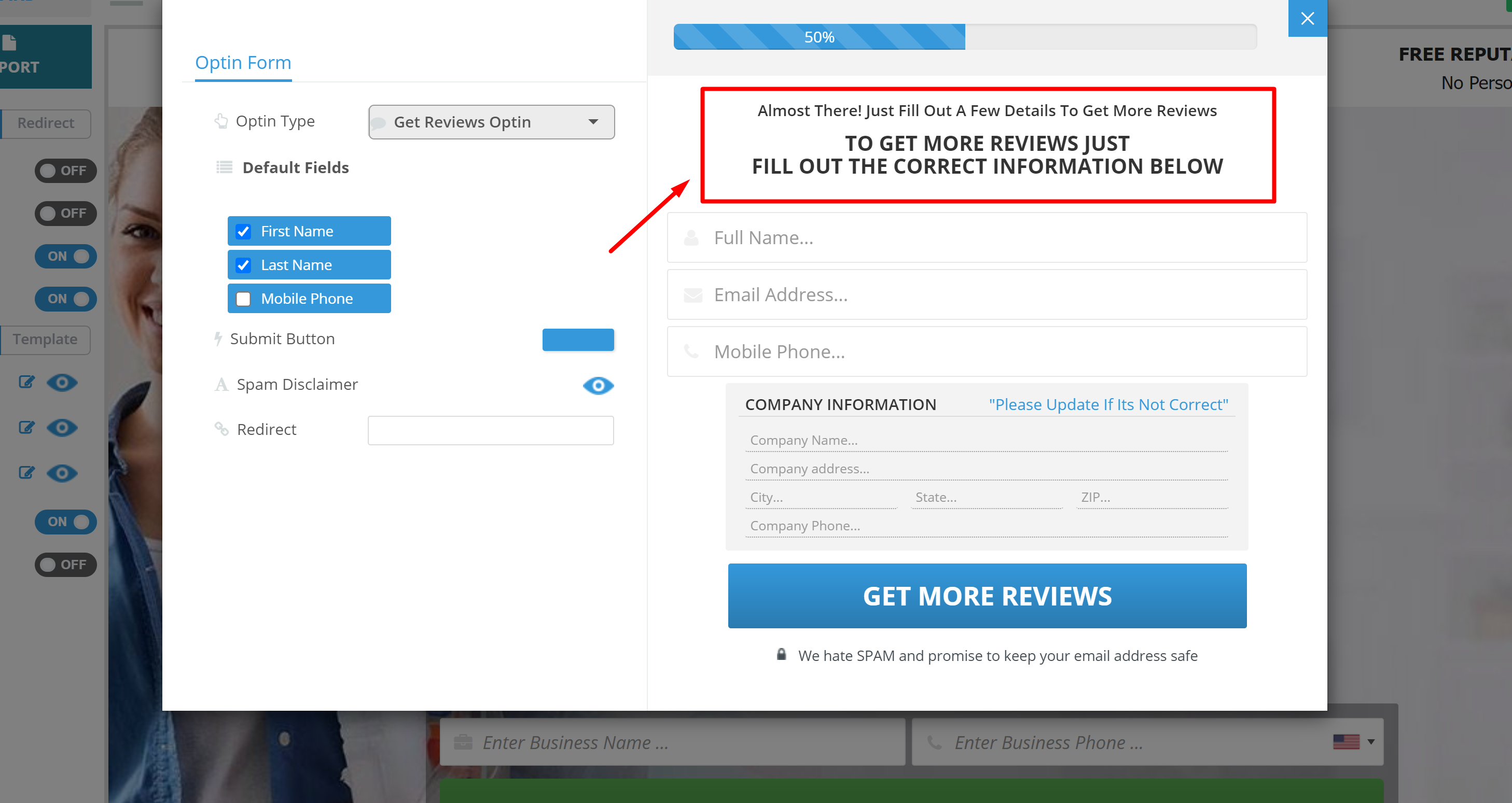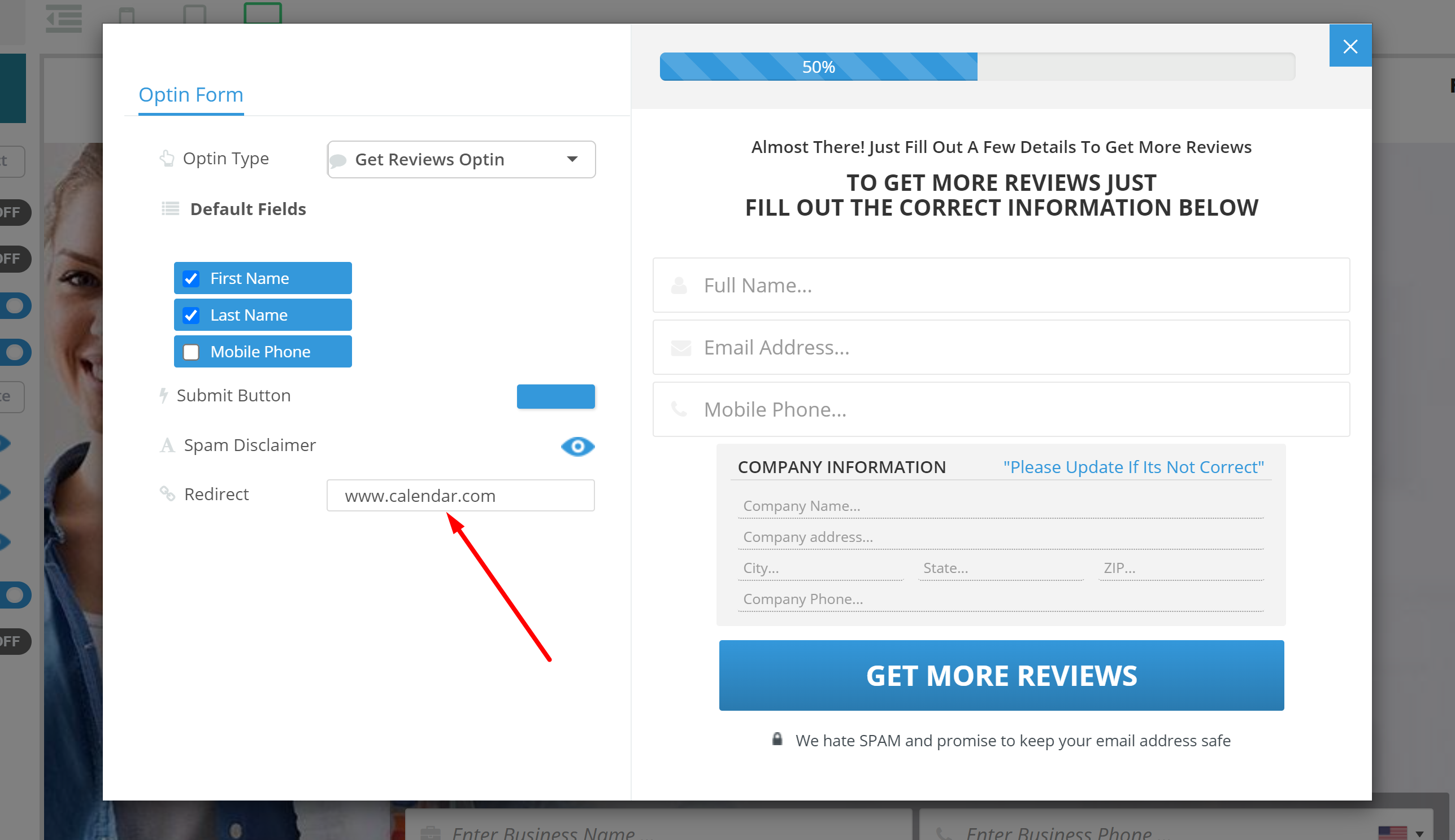 3. Enter a link in the redirect field if you'd like prospects to be redirected. One of the best strategies is to redirect to your calendar allowing your prospect to self-book an appointment with you.
