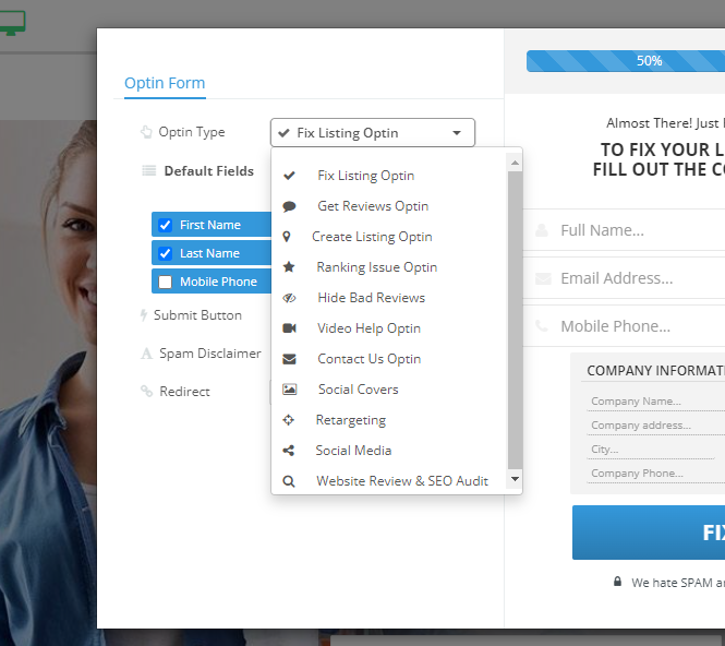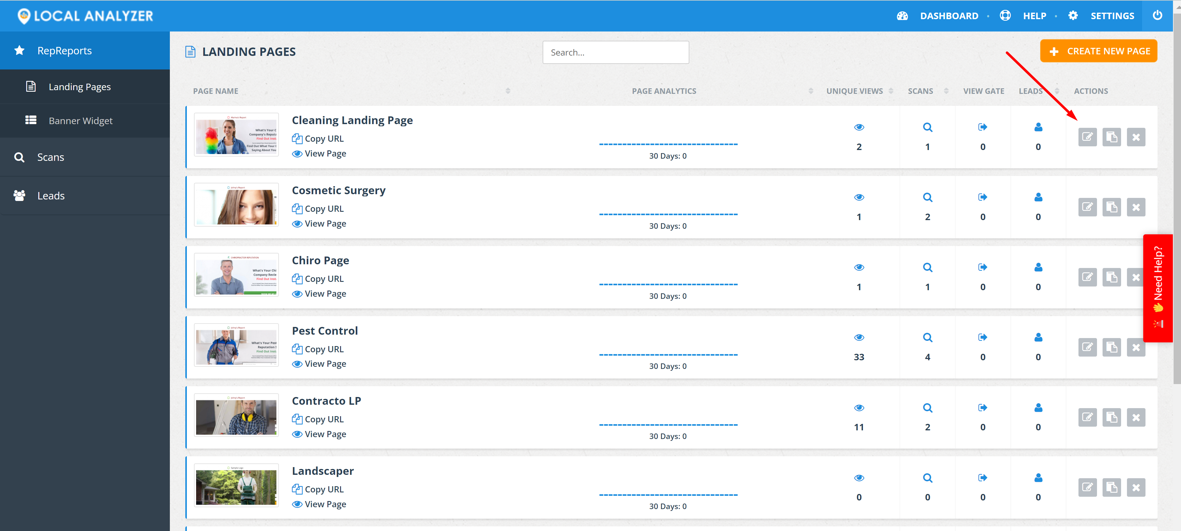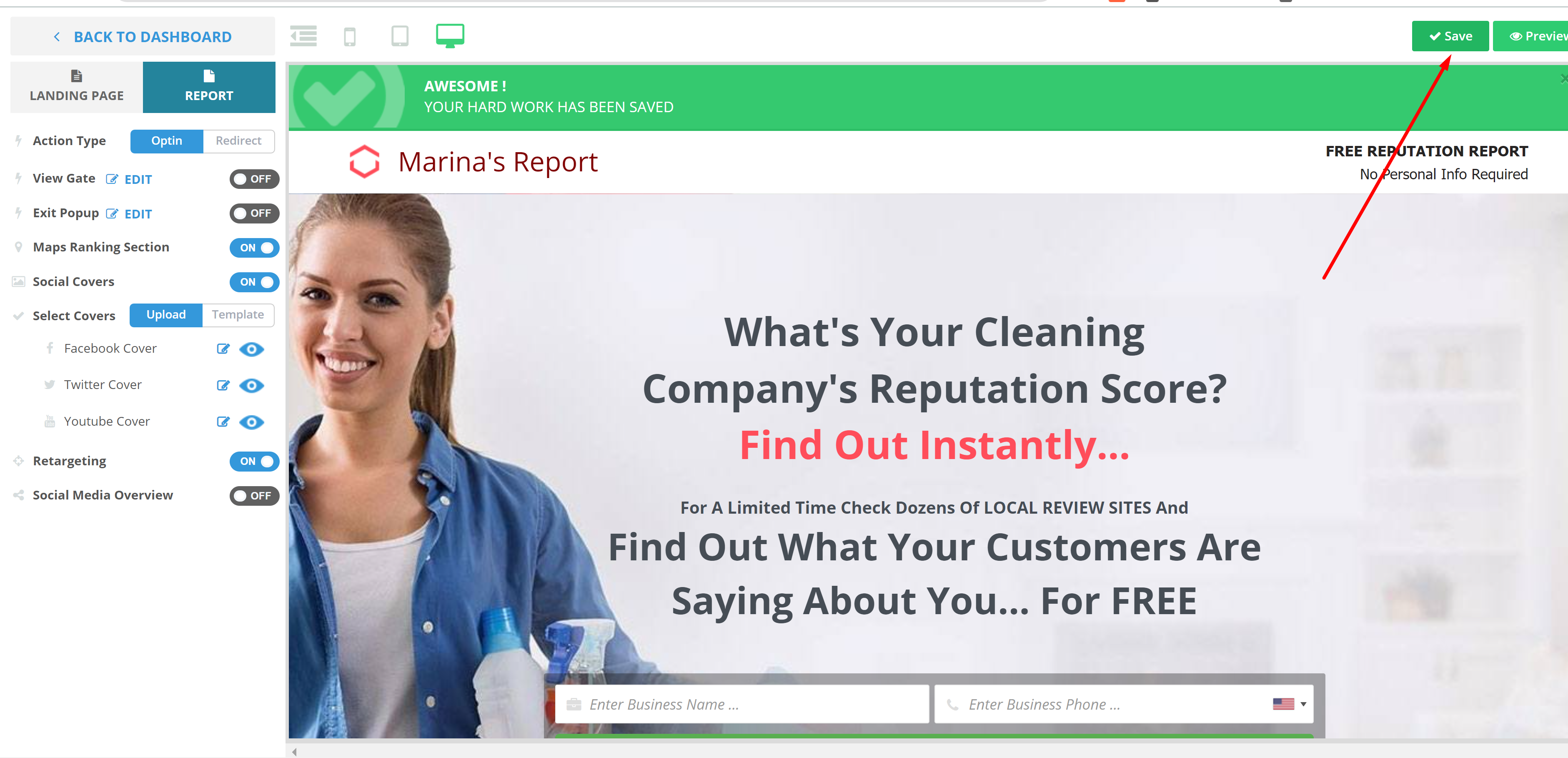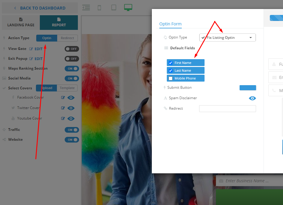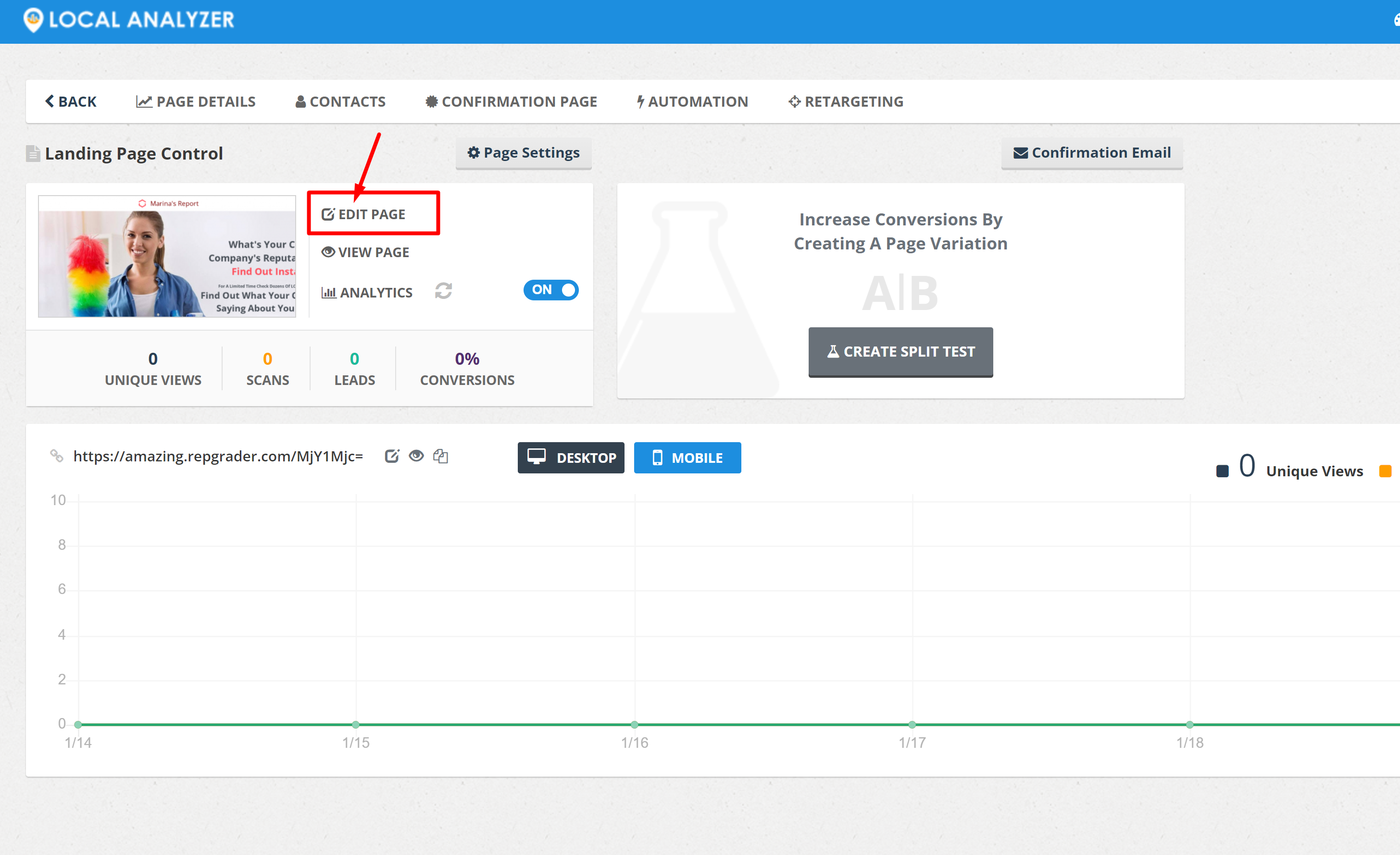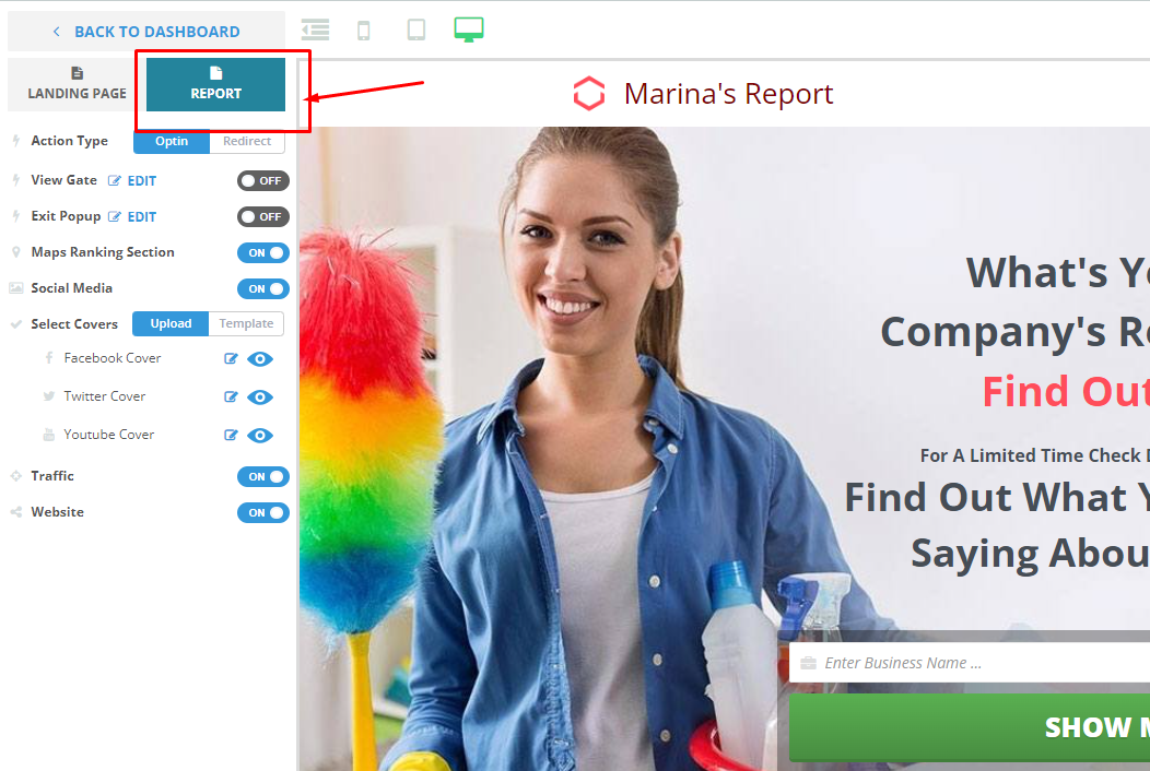 To make adjustments to various opt-ins on the Local Analyzer Report, start with the Landing page setup.