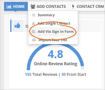 Step 1. From the merchant's dashboard, hover your mouse over the Add Contacts tab and select Add Via Sign In Form.