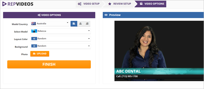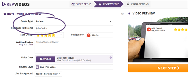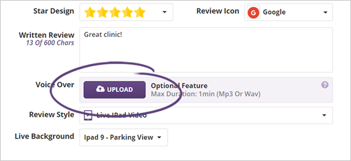 Rep Videos will put that voiceover over top of the written review displayed in the video. Click Upload and attach an .mp3 or .wav file of the voiceover.