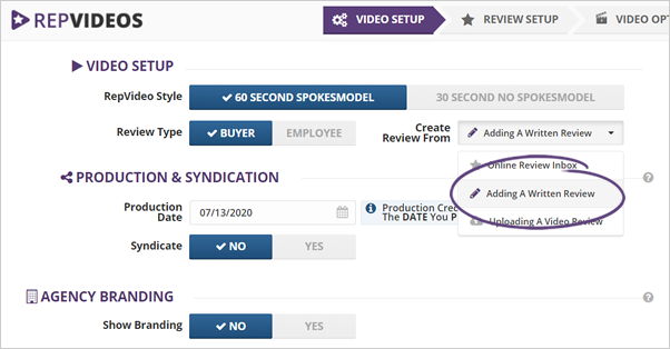 Choose between Buyer or Employee Reviews. Once the Review Type is selected, select Adding a Written Review.
