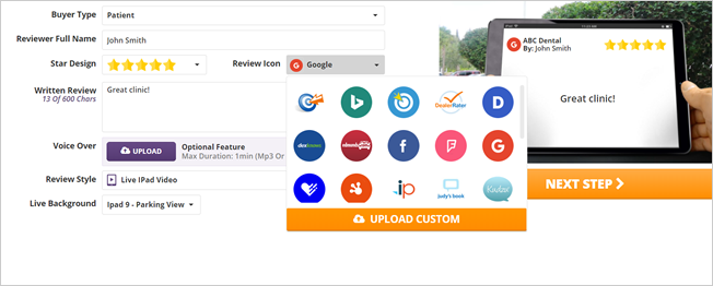 Enter the written review, edit it if needed, and then choose the icon associated to where the review came from. Icons can also be uploaded if needed.