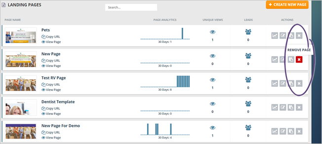 Step 2. Click the Remove Page icon on the landing page that you want to delete.