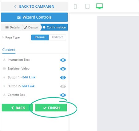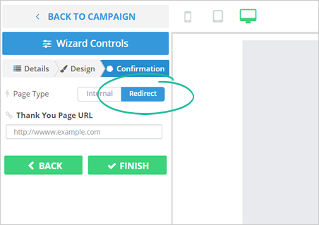 Step 13. On the Confirmation Wizard Step, you have the option to use the built-in Confirmation Page or your Confirmation Page. If you want to send leads to your page, select Redirect and paste its URL address.