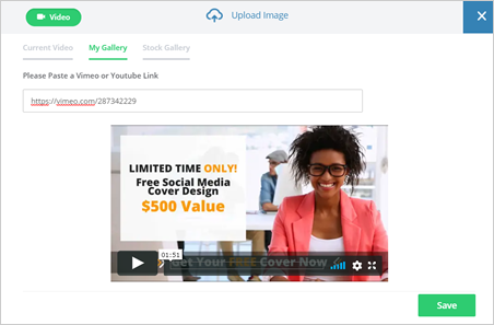 Step 11. Paste the Vimeo or YouTube link of your video and click Save. Once the you saved your video, click the Select button.