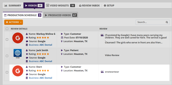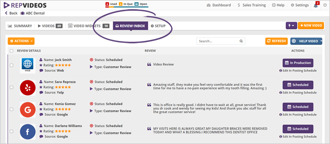 Step 2. Once Rep Videos has pulled in the reviews, you will have those reviews inside of the Review Inbox.