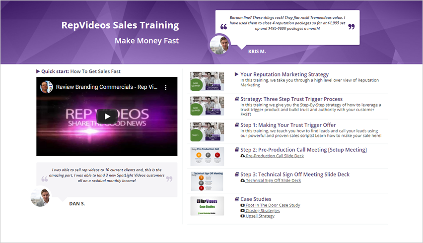 You can check our Reputation Marketing Strategy, Case Studies, and the Three-Step Trust Trigger Process that will help you sell Rep Videos.