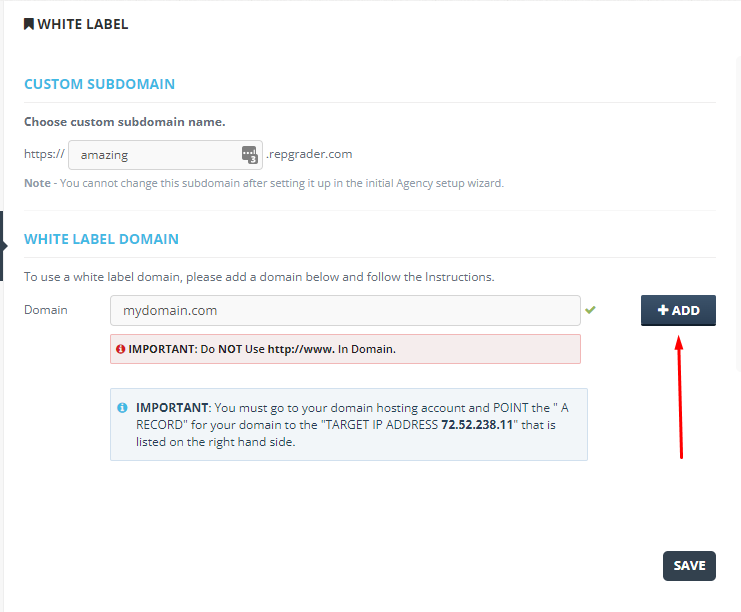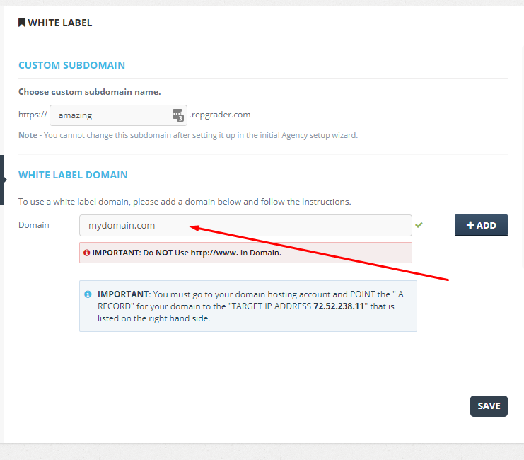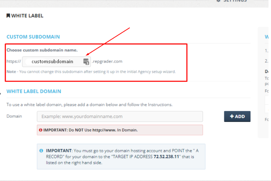 Step 4. Add an A Record to your domain provider account redirecting to the IP address 72.52.238.11 for a FULL DOMAIN and a CNAME record redirecting to the initial subdomain that you created at the agency setup step: