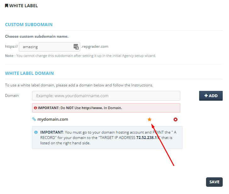 NOTE: If you are adding multiple domains, please mark the one you want to use by default by clicking on the star icon next to the domain you want to be a default domain: