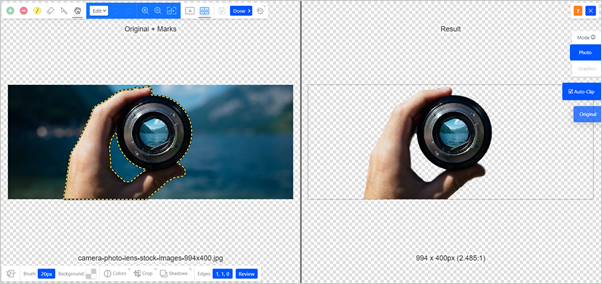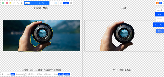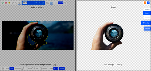 Once your image is uploaded, you will see them on the image editor. The left window contains the original image while the right panel is the actual result of the edited image.