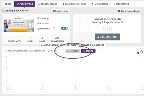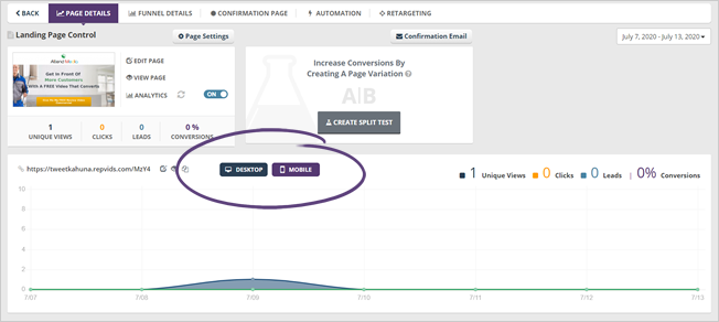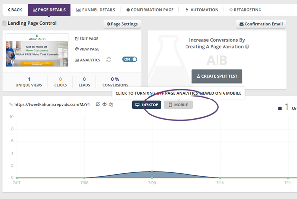 You will see a different number of views on your Landing Page, depending on which button you have toggled. You can toggle both Desktop and Mobile views, or if you want to more specific, you can view which visited on desktop or mobile only. By default, both Desktop and Mobile views are toggled.