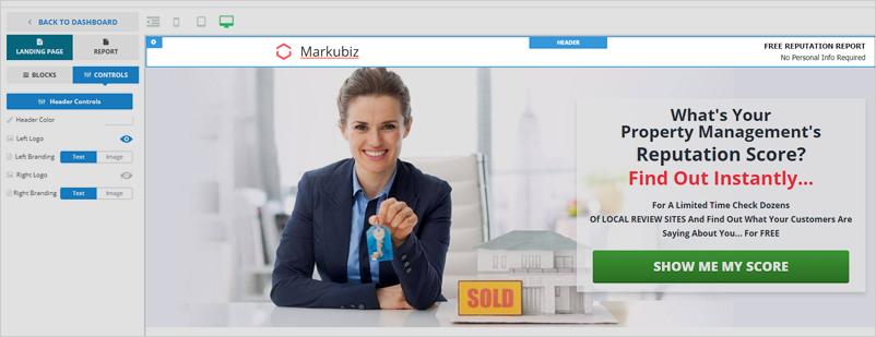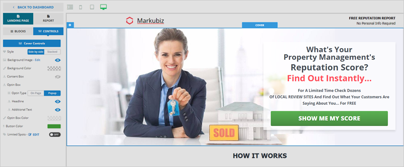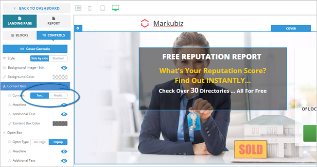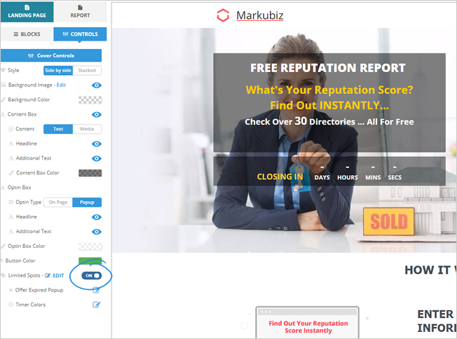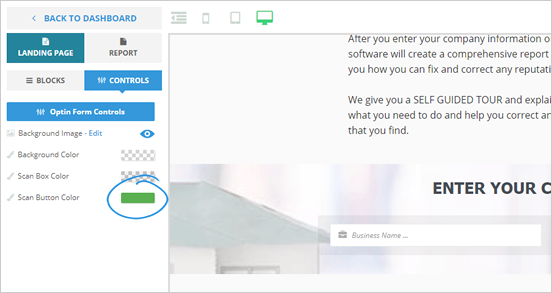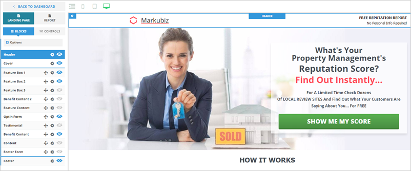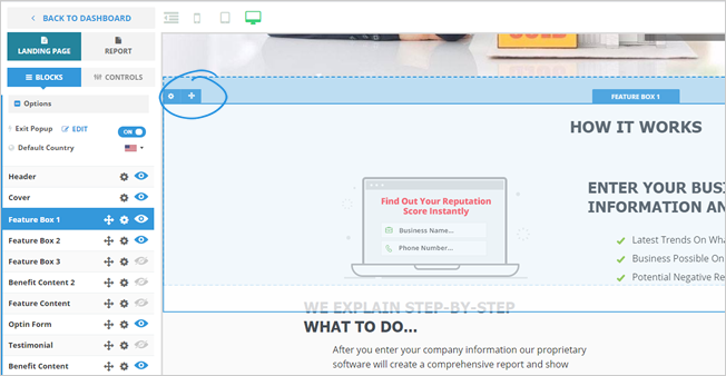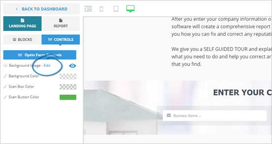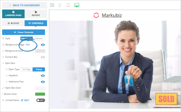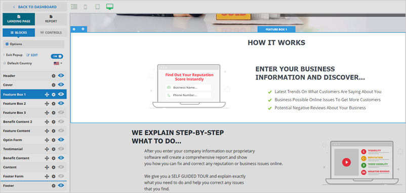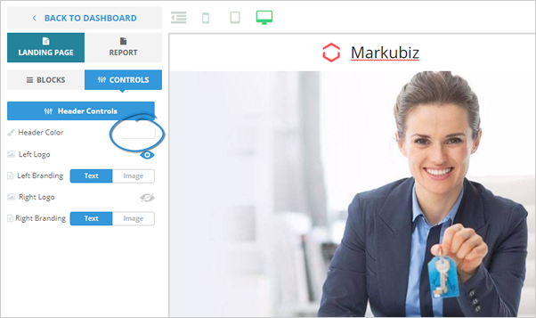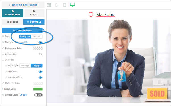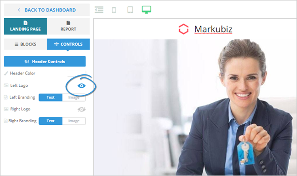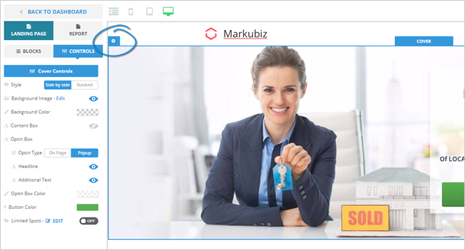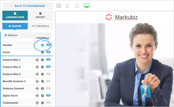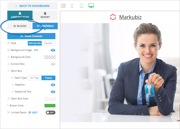 Landing Pages are separated into two important parts - blocks and controls. Once you click on the blocks, it will operate each of the blocks on the landing page.