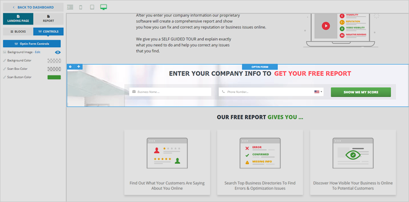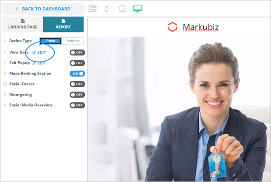 Report controls – click report and action type. Adjust your Optin. To update your optin form, select the headline, add optin fields (add a checkmark if field is mandatory), and add mobile phone. Save your page once you are done.
