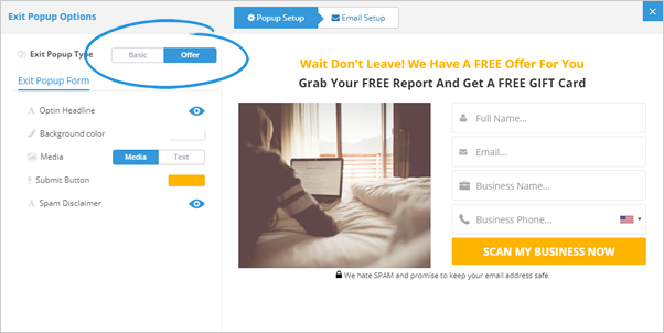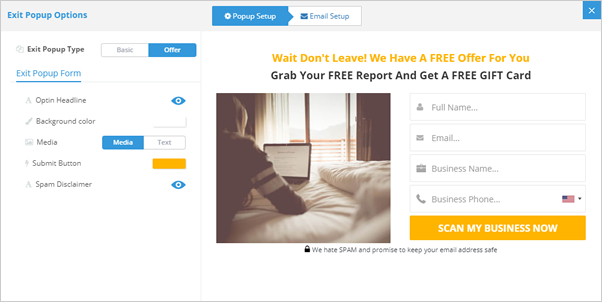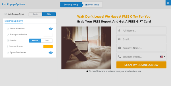 There are two exit popup types - Basic Exit Popup and Offer Popup. Basic Exit Pop-up only asks for basic information, like a business's name and phone number. On the other hand, Offer Popup asks for the user's name and email and their company's information. You also can add a video in your Offer Popup, which makes this popup very customizable.