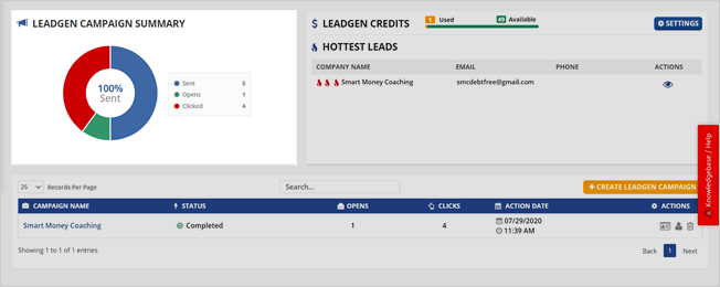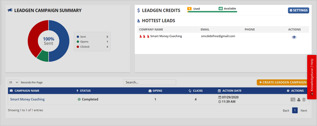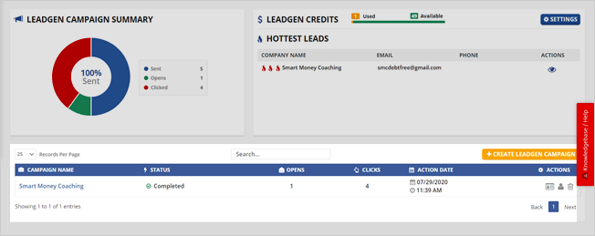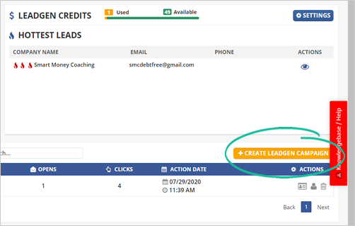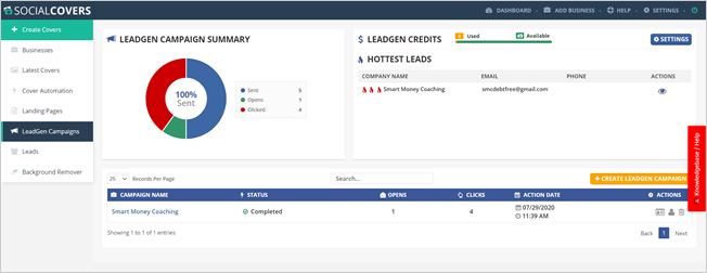 On your Lead Gen Campaigns Dashboard, you will find all the campaigns that you started previously. You will see all of your hot leads, and the data about your clicks, opens, and emails you have sent.