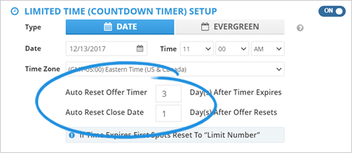 The example below has the Auto Reset Offer Timer set to three days after the timer expires. The Auto Reset Close Date is set to one Day After Offers Resets. In this setup, let us say today is Monday, and we are going to close this down on Friday. If our Spot is six and no one takes advantage of the offer, and it comes to Friday at 1 o'clock, that means that this offer will shut down, but it will auto-reset three days later.