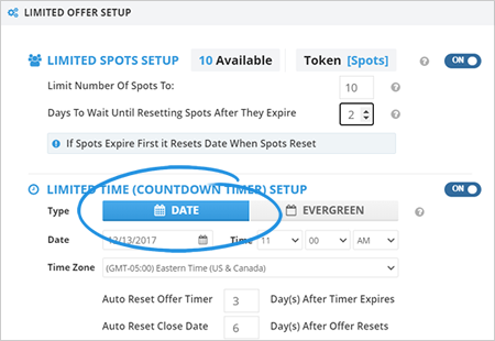If you select Date, you choose the time, date, and timezone, and the offer will count down until that time ends. Once the time ends, the offer is shut down.