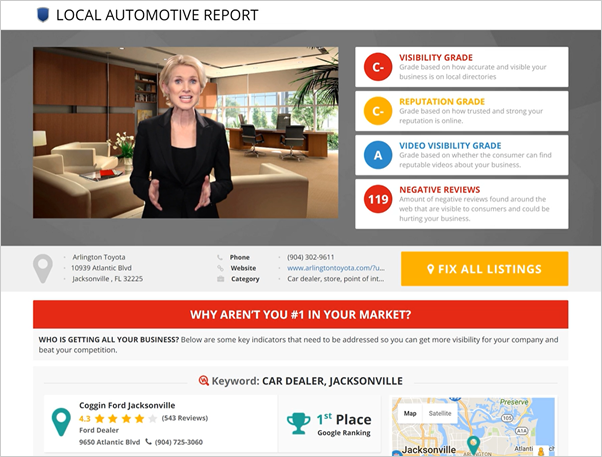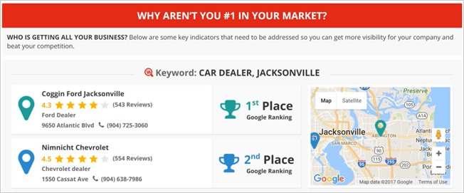 The top part of the report will specify the keyword for which the report was generated, which, in this example, is the car dealer in Jacksonville. The report will also show you your immediate competition and who is in first and second place. Keep in mind that it is not enough to know the competition in the area. You need to know how to beat them and what to do to become better.