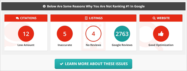 When the user is ready to fix their issues, they click Learn More About These Issues and send their information to get help and improve their ranking.