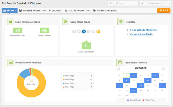 The Market Dashboard gives you an overview of your customer's Social Review Marketing, Social Reach, Analytics, and the Social Media Schedule. We are ready to take all of these from your customers and market it online.