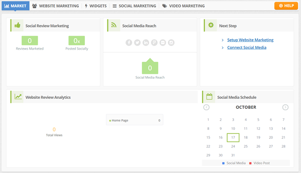 The Market Dashboard gives you an overview of your customer's Social Review Marketing, Social Reach, Analytics, and the Social Media Schedule. We are ready to take all of these from your customers and market it online.