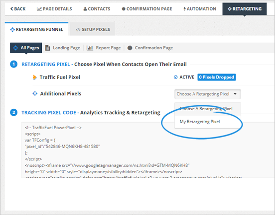 Using a retargeting software will automatically pixel each open or click emails which will help you retarget your prospects. You can either use Traffic Fuel which is our proprietary retargeting software in your Retargeting Funnels or use an additional retargeting pixel of your choice.