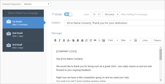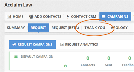 Don’t forget to thank your clients and customers by sending them a thank you message each time they leave excellent feedback. Rep Kahuna does that for you through the Thank You Campaign, which sends emails automatically each time your customer or client leaves positive feedback.
