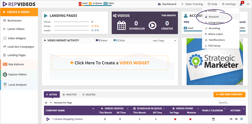 To access the Account section, hover your mouse over Settings found on the main dashboard's upper-right hand corner and select Account from the drop-down.