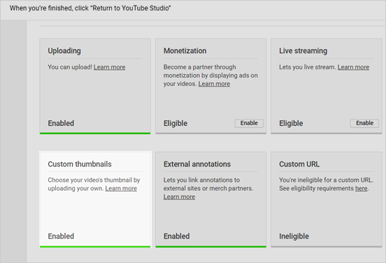 Step 6. You can now see that your YouTube Account is Verified, in Good Standing, and your Custom thumbnail is turned on.