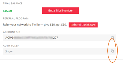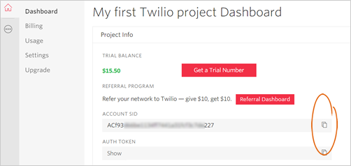 Step 2. From the dashboard, click the copy icon of Account SID to grab your Twilio Account SID.