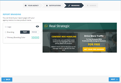 This section allows you to report your Branding. Customize your report page by uploading your logo. Set your Branding to be either text or an image. You also have the option to choose your Primary Branding Color. Click Next to proceed to the next section.