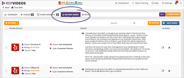 Complete your Video Setup. Once you are done with this step, proceed to your Review Inbox to see the reviews that the system pulled up for you.