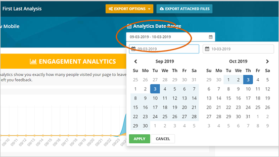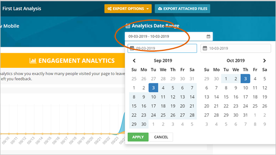 Step 1. From the analytics page, click the calendar icon and choose a date from the calendars to change the period from which analytics will be drawn from. Click Apply after you have selected two dates.
