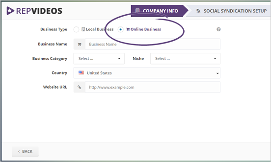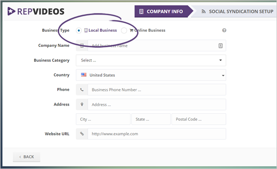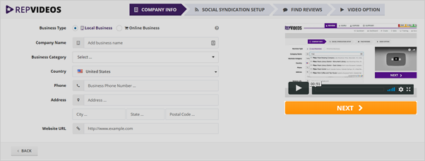 On the first step of the Business Setup, you will be filling out the details for the business that you want to create a Rep Video for.