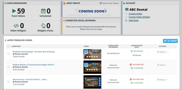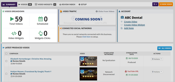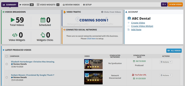 There are a few quick links from the Account section that you can click when you want to create a new video, create a video widget, or add a note for this business that you are working with.