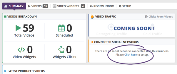 On the Summary page, you will find the details about the videos that have been created on this account. You will see the information on the account itself, the traffic, and social networks that have been connected to the account.