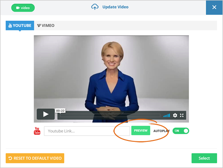 Step 10. Paste the YouTube link of your video then click Preview. Click Select to replace the default video.
