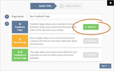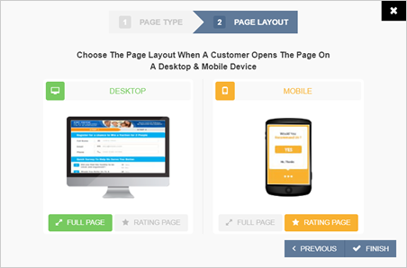 Step 7. Select your Page Layout. For demonstration purposes, we will be selecting the Full Feedback Page for the Desktop and Rating Page for Mobile. Click Finish.