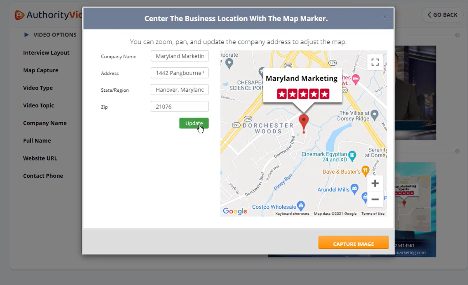 The Map Capture is a cool feature of Authority Videos where you can put in the business location and will display the actual map location of the business. Powered by Google Maps, easily take a screenshot of your location and post it inside the Interview Video.